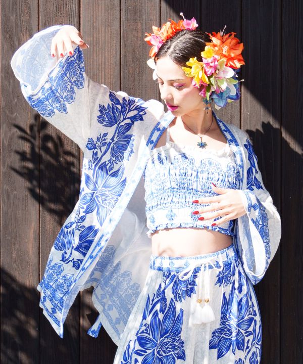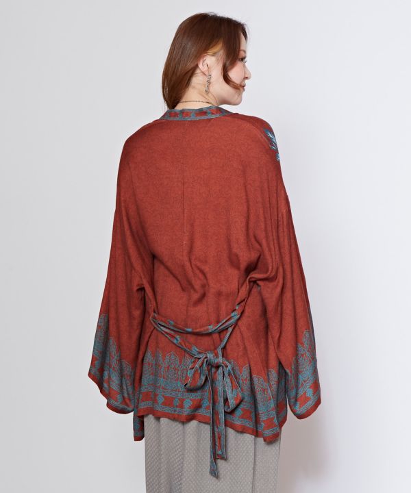 レーヨン素材ならではの落ち感と表面感が魅力的な、UVカット加工のカーディガン。トルコのタイルから着想を得たオリエンタルなロータス柄デザイン。ワイドな袖とベルト付きで気分によって動きをプラスできる。便利な内ポケット付き。