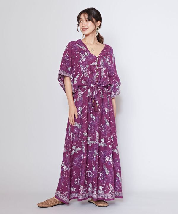 箔プリントが目を引く、大胆なVネックワンピース。星座の絵と共に夏の大三角形が描かれたテキスタイル。落ち感が綺麗なレーヨン素材。ウエスト紐でスタイルアップ効果も。タッセルには星のチャーム、胸元にはメタルボタン。嬉しいサイドポケット付き。