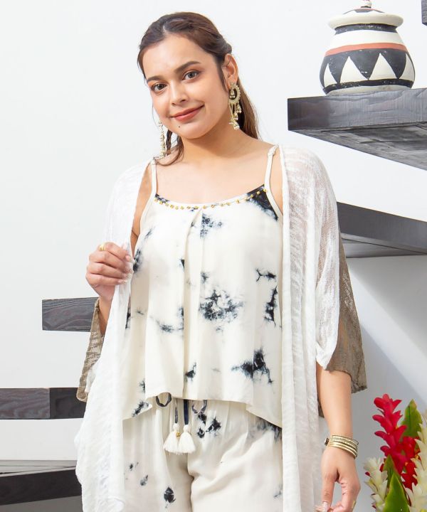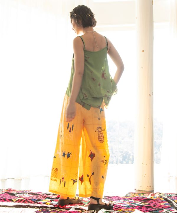 インドのタイダイ柄が映えるキャミソール。肩紐は調節可能で、胸元にはインド舞踊「カタックダンス」で足につける鈴「グングル」がアクセントとしてあしらわれている。個性的な変形デザインが、動きにあわせて揺れるシルエットを楽しませてくれる。