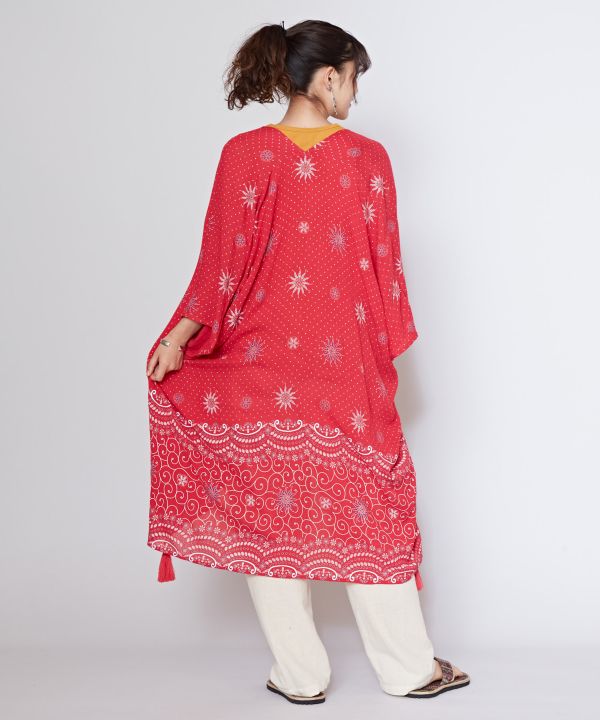 ステンドグラスの柄から着想を得たデザインのUV加工付きのカーディガン。鮮やかな色展開はステンドグラスをイメージ。生地はレーヨンクレープを使用しており、軽く涼しいので強い日差しの日にも大活躍。