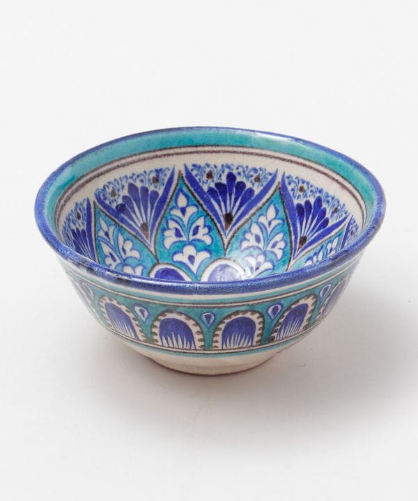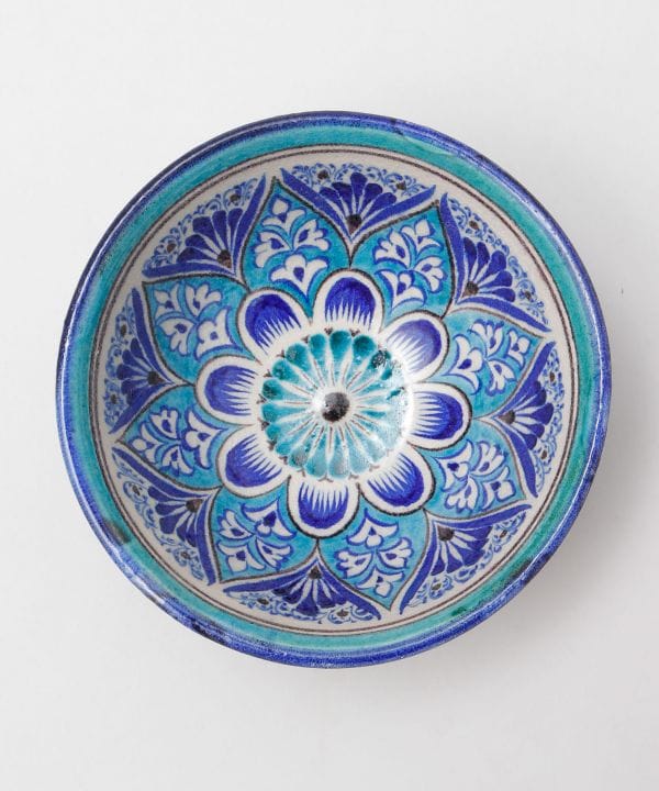 ウズベキスタンから直輸入したリシタン食器のボウル。リシタン食器は「リシタンブルー」と呼ばれ、イスラム文化で平和を意味するとされています。ザクロや唐辛子など、ウズベキスタンで縁起物とされているモチーフが描かれているのが特徴です。唐辛子は魔除け、ザクロは豊穣子孫繁栄、八角形は吉祥や平和を願う意味が込められたモチーフとなっています。