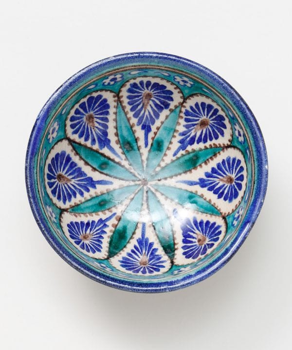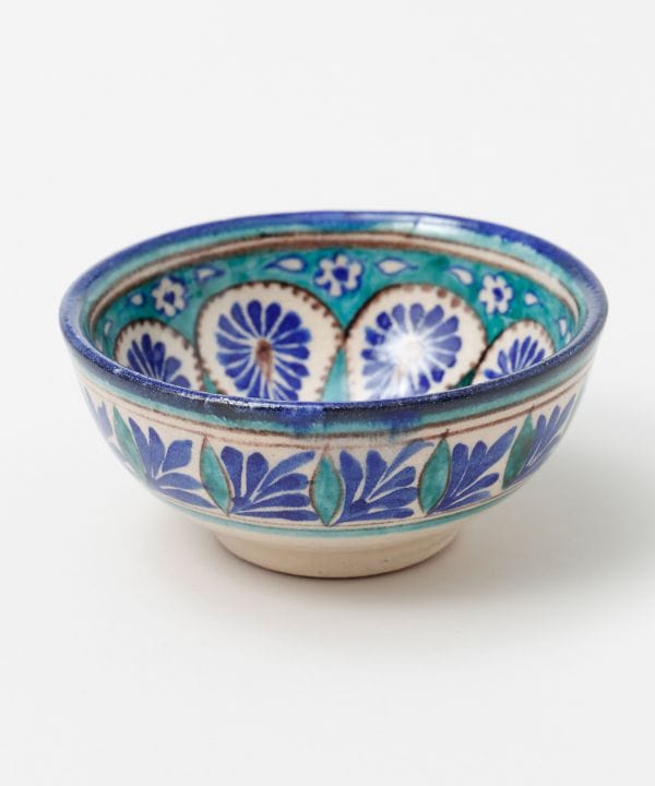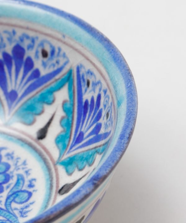 ウズベキスタンから直輸入したリシタン食器の茶碗。リシタン食器は「リシタンブルー」と呼ばれ、イスラム文化で平和を意味するとされています。ザクロや唐辛子など、ウズベキスタンで縁起物とされているモチーフが描かれているのが特徴です。唐辛子は魔除け、ザクロは豊穣子孫繁栄、八角形は吉祥や平和を願う意味が込められたモチーフとなっています。