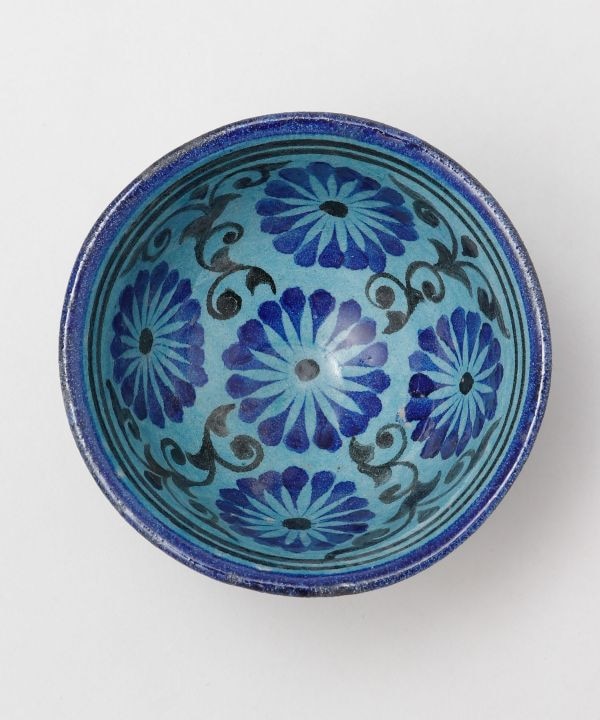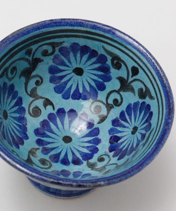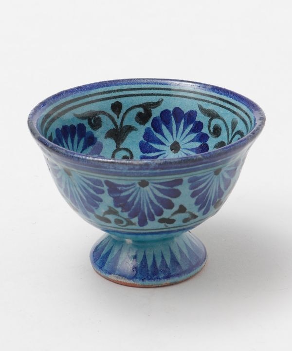 ウズベキスタンから直輸入したリシタン食器の脚つき小皿。リシタン食器は「リシタンブルー」と呼ばれ、イスラム文化で平和を意味するとされています。ザクロや唐辛子など、ウズベキスタンで縁起物とされているモチーフが描かれているのが特徴です。唐辛子は魔除け、ザクロは豊穣子孫繁栄、八角形は吉祥や平和を願う意味が込められたモチーフとなっています。