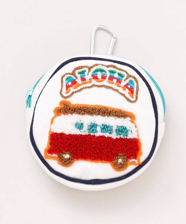 ハワイならではのモチーフをワッペン風のサガラ刺しゅうにしたラウンドポーチ。カラビナ付きでバッグのアクセントにも付けられます。お気に入りのバッグやベルトループにつけてお楽しみいただけます。