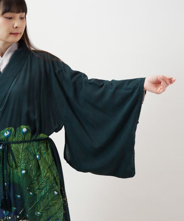 美しい鳥獣をモチーフにした着物風羽織。「鳳凰(ほうおう)」「龍」「孔雀」を大胆にデザイン。紐が付いているので着物のように衿を合わせてワンピース風に着ることもできます。鳳凰:平和と幸福の象徴。龍:成功と発展の象徴。孔雀:富と繁栄の象徴。