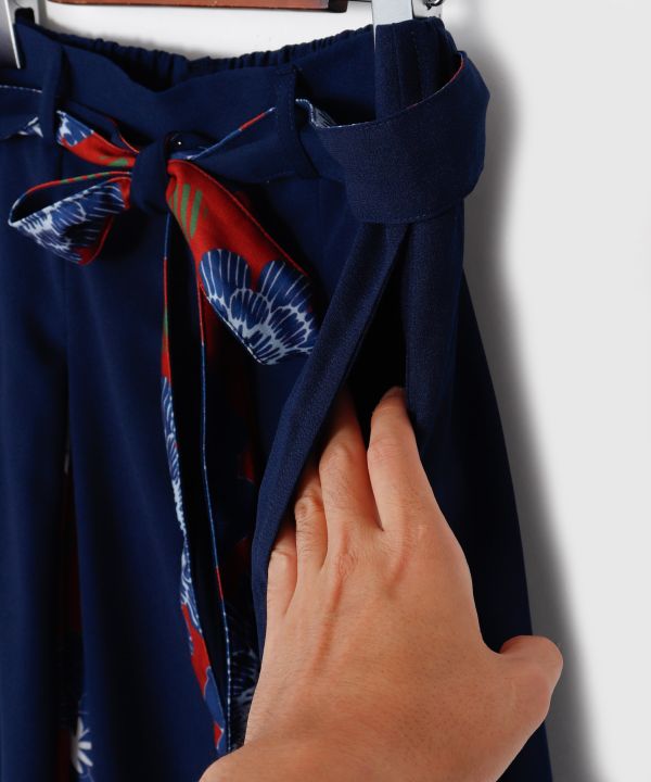 無地と花柄をレイヤード風に組み合わせたパンツ。着物の帯をイメージした無地×花柄のベルト付き。落ち感のあるデザインとゆったりとしたウエストで着心地抜群。牡丹と麻の葉モチーフの華やかな柄と、鮮やかな色展開が魅力の一枚です。