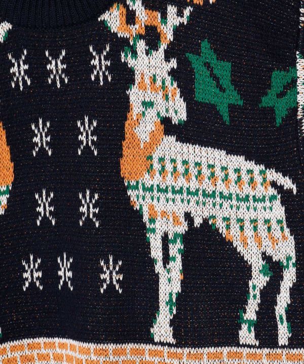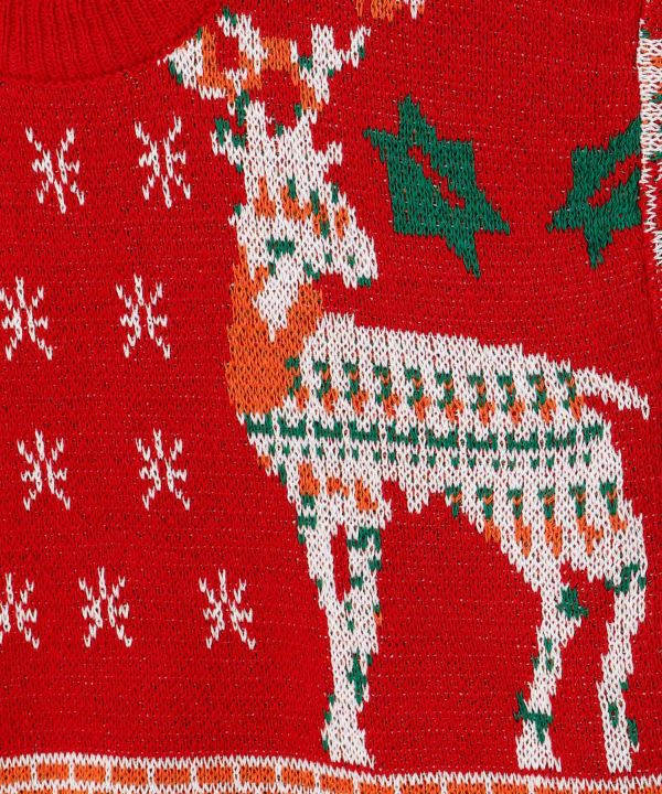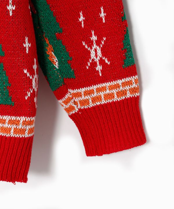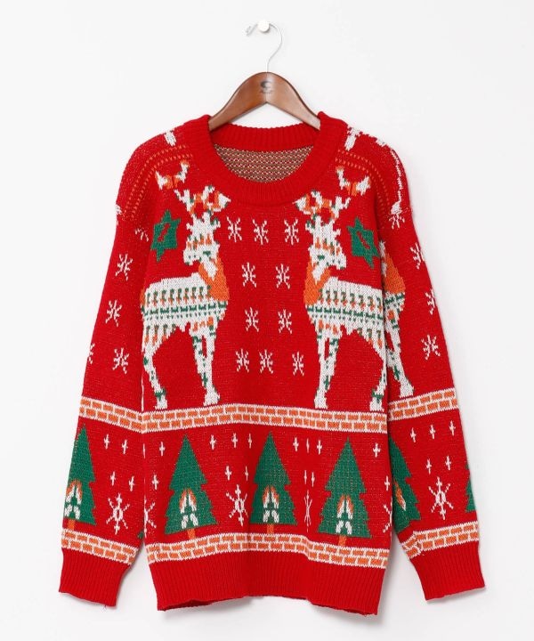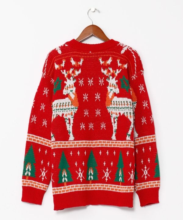 クリスマスツリーと大きなトナカイをあしらった、季節感たっぷりのニット。