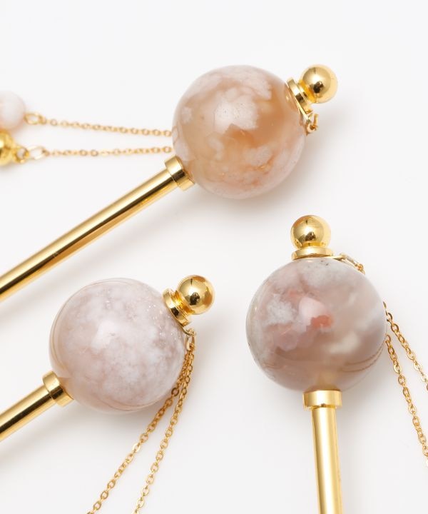 桜瑪瑙のひとつひとつ色、模様の出方が異なるかんざし。【サクラメノウ】疲れた心を癒す意味と効果があるといわれています。「怒り」「悲しみ」「不安」「憎しみ」「絶望」などを、癒してくれます。再び前を向いて進む、気力が取り戻されるようにサポートしてくれる石です。※一点一点色味が異なるアソート商品です。※写真は一例です。※一点をお届けします。