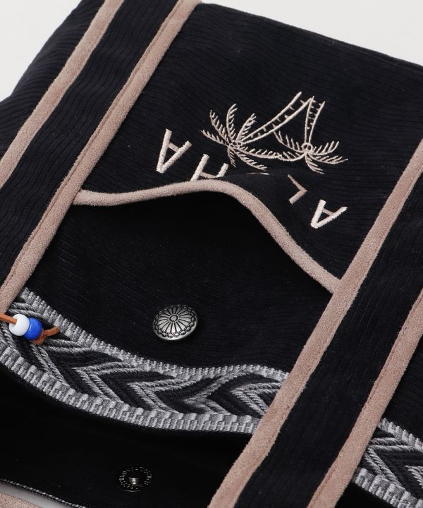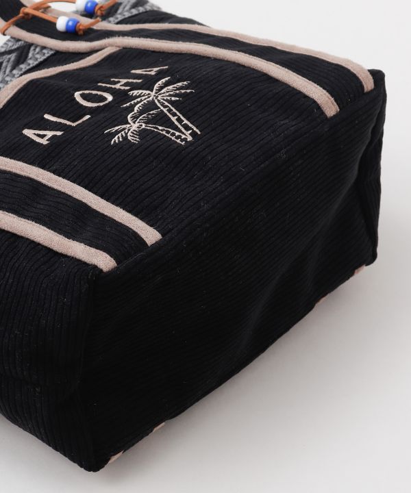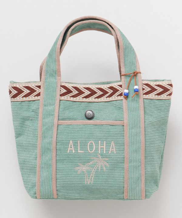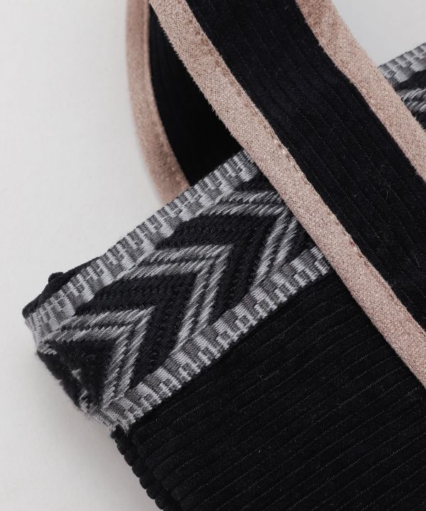 テープとフェイクスエードのパイピングデザインが特徴のミニトートバッグ。フロント部分と内部にポケットがあり、とても便利です。さりげないビーズのチャームもアクセントに。