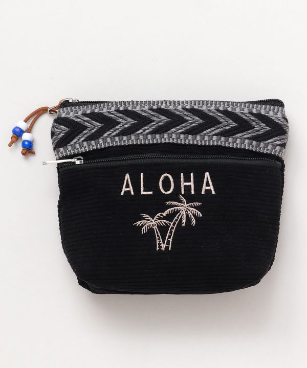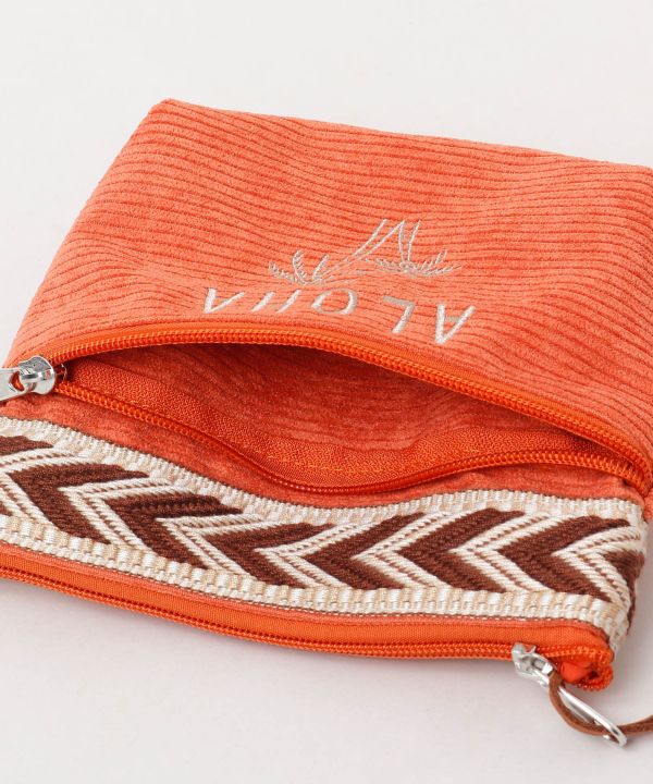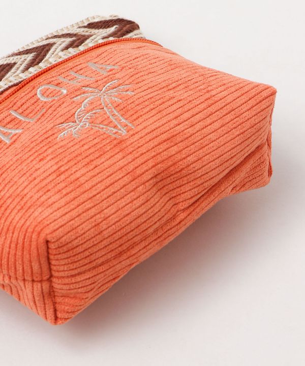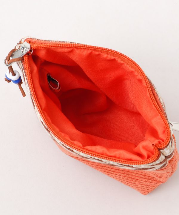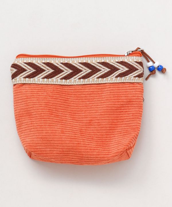 テープとフェイクスエードのパイピングデザインが特徴のカジュアルなポーチ。フロント部分にジッパー付きのポケットがあり整理がしやすいです。ビーズのチャームが付いているので、開け閉めしやすいです。