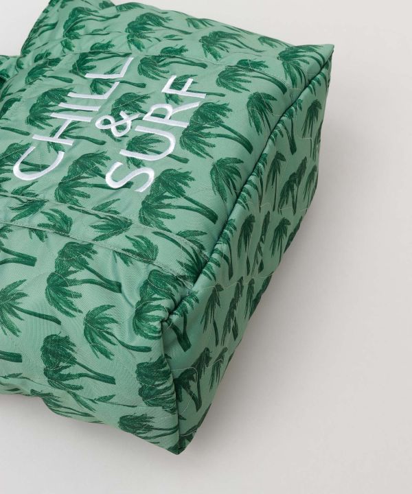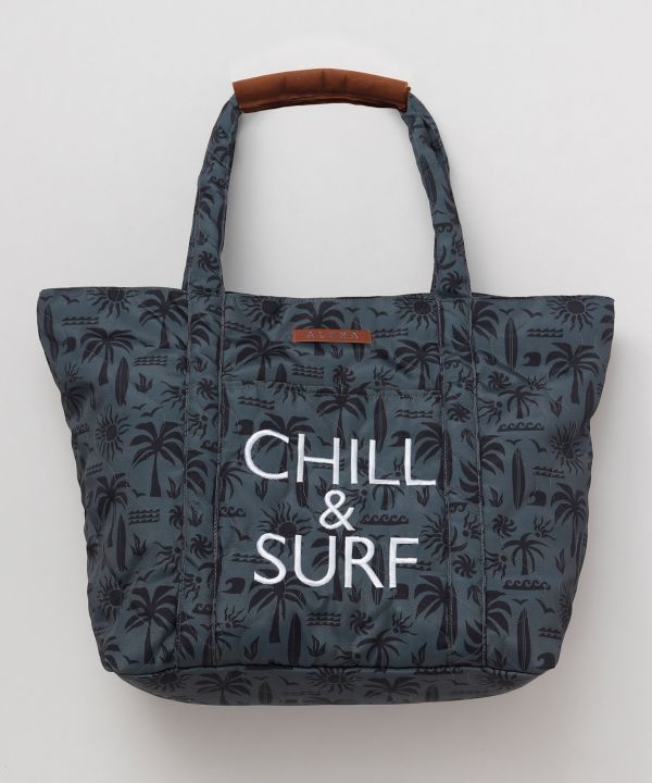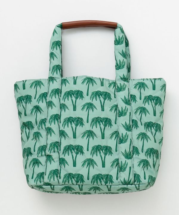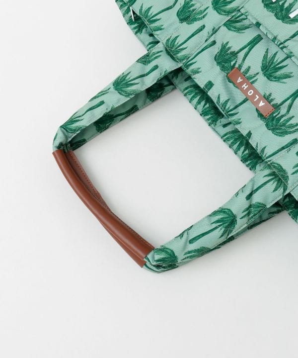 全面総柄のキルティングのバッグ。ファスナーが付いていて、外と内側にポケットがあり、とても使いやすいです。ALOHAのタグと刺しゅうがポイント。大きくて軽く、しっかりと起立するので、旅行にも便利です。持ち手がしっかりとしているので、重い荷物でも持ちやすいです。