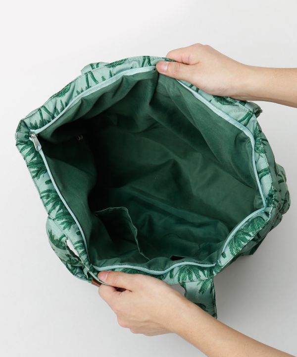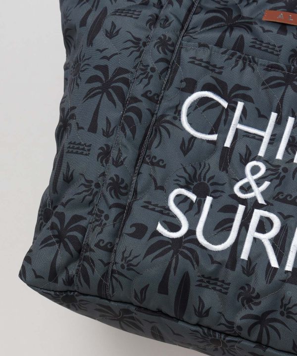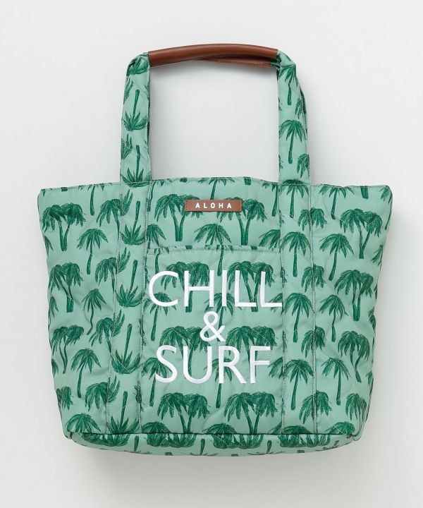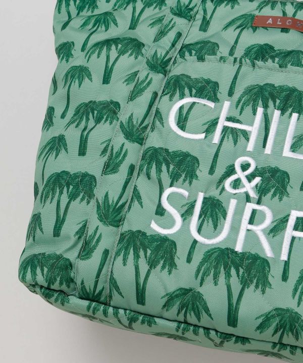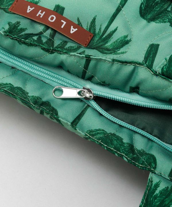 全面総柄のキルティングのバッグ。ファスナーが付いていて、外と内側にポケットがあり、とても使いやすいです。ALOHAのタグと刺しゅうがポイント。大きくて軽く、しっかりと起立するので、旅行にも便利です。持ち手がしっかりとしているので、重い荷物でも持ちやすいです。