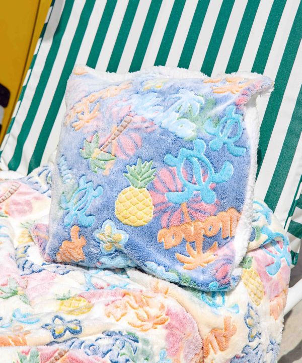 ポップなカラーリングでハワイのモチーフがぎゅっと詰まったふわもこクッションカバー。凹凸のある生地感で手触りの良いシリーズは、柔らかボアの身も心も温まるプレゼントとしても喜ばれます。