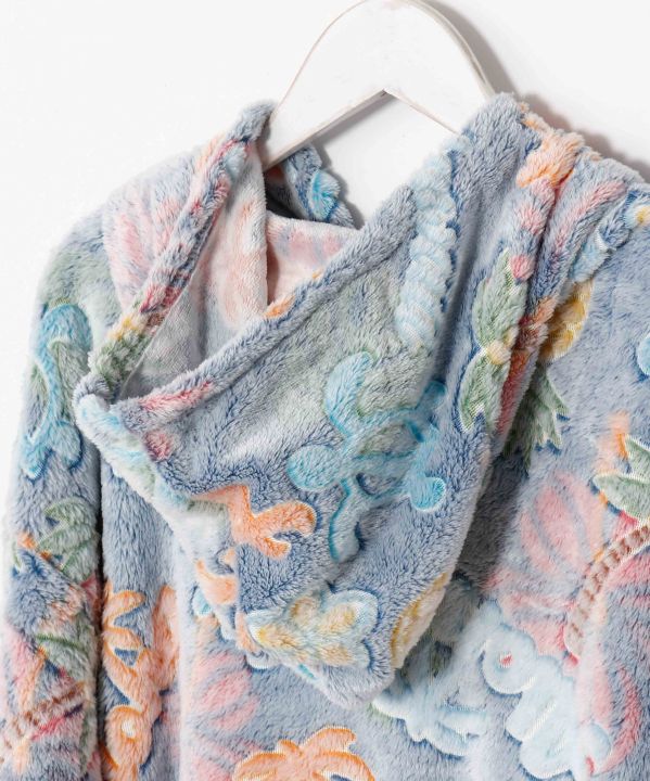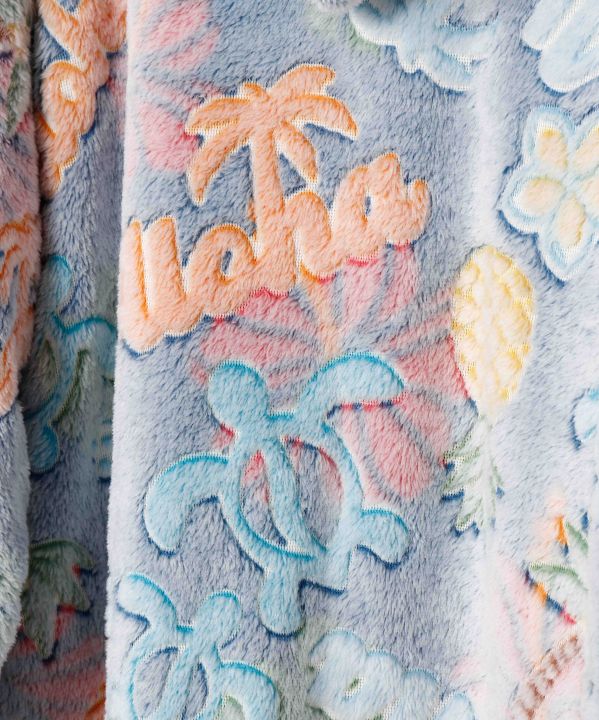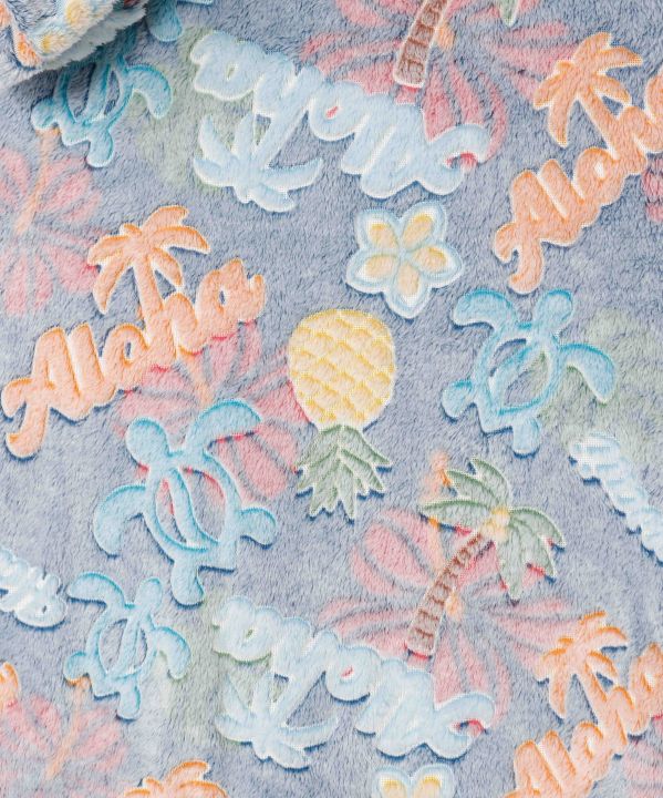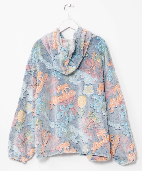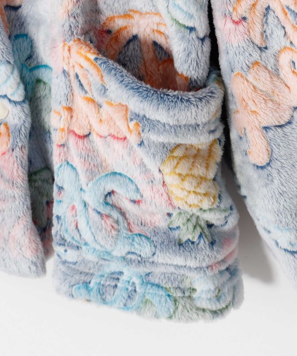ポップなカラーリングでハワイのモチーフがぎゅっと詰まったふわもこカーディガン。フリーサイズの温かなルームウェアとして、プレゼントにも喜ばれます。凹凸のある生地感で手触りが良く柔らかボアは身も心も温めてくれます。