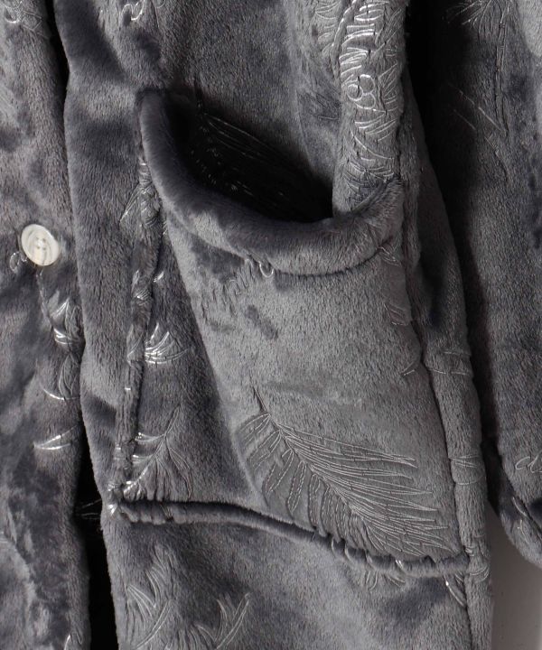 上品なヤシ柄が箔プリントされた大人な雰囲気のロングカーディガン。 肉厚で暖かく、表は滑らかなフリース、裏はしっとりとしたボアで 仕上げられているので、くつろぎの時間にぴったりです。