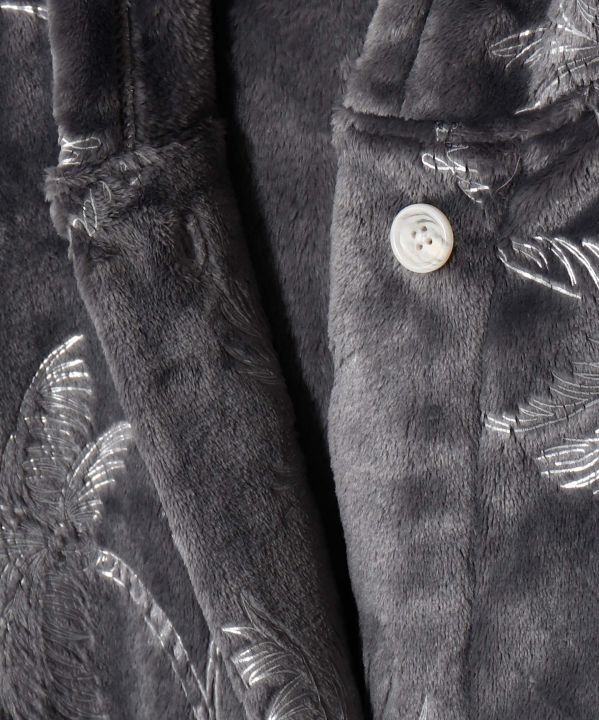 上品なヤシ柄が箔プリントされた大人な雰囲気のロングカーディガン。 肉厚で暖かく、表は滑らかなフリース、裏はしっとりとしたボアで 仕上げられているので、くつろぎの時間にぴったりです。