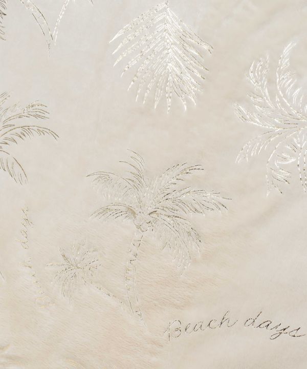 上品なヤシ柄が箔プリントされた大人な雰囲気のブランケットが登場。 生地は肉厚で暖かく、表は滑らかなフリース、裏はしっとりとしたボアで 仕上げられています。