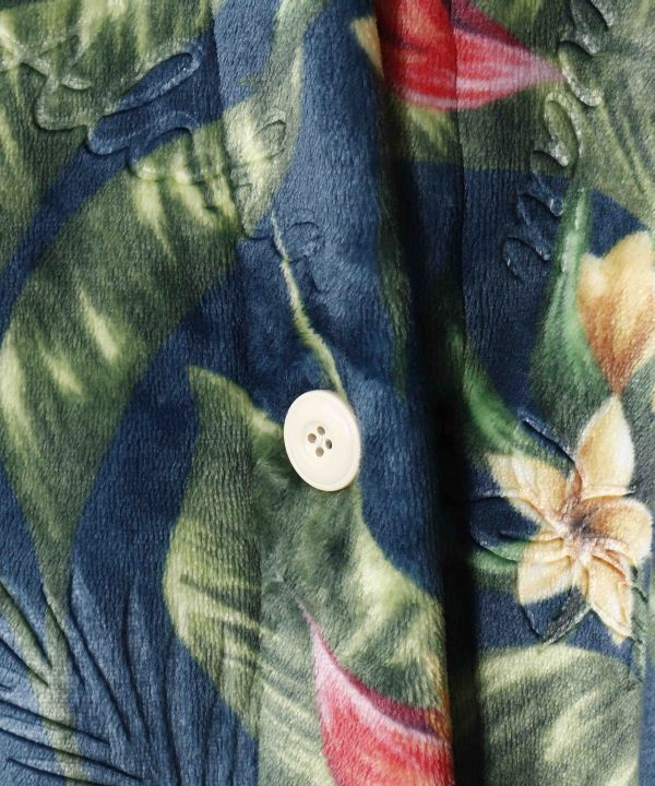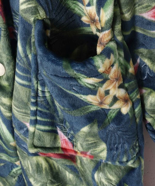 ハワイアンボタニカル柄に、型押しでAlohaロゴやパームリーフ柄が押されている上品な雰囲気のカーディガン。フリーサイズの温かなルームウェアとして、プレゼントにも喜ばれます。鮮やかなボタニカル柄と柔らかなボアは、身も心も温まり日々のライフスタイルを素敵に演出してくれます。