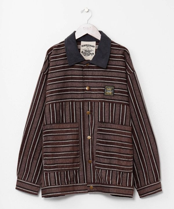暖かみのあるストライプ柄に、衿のコーデュロイ生地がポイントのメンズジャケット。ワークテイストな大きめポケットは上からも横からも手を入れることができる機能性の高い一着です。