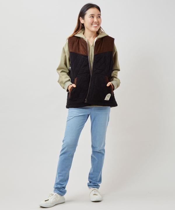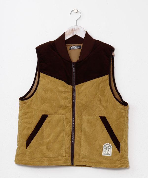 コーデュロイ生地のキルティング風メンズベスト。目を惹く配色がコーディネートのアクセントに。中綿入りで暖かく、インナー次第で長い期間着用できるアイテムです。