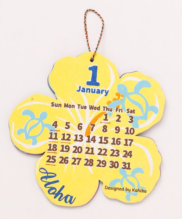 華やかなハイビスカスが描かれたダイカットカレンダー。環境にやさしいエコな素材で作られていて、ハワイの自然を大切にする優しさが詰まっています。表紙+6ページ。