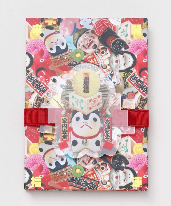 日本の縁起物や祝いものを詰め込んだ、賑やかなデザインの「開運来福」御朱印帳。専用のゴムバンドもついてるので便利に使えます。