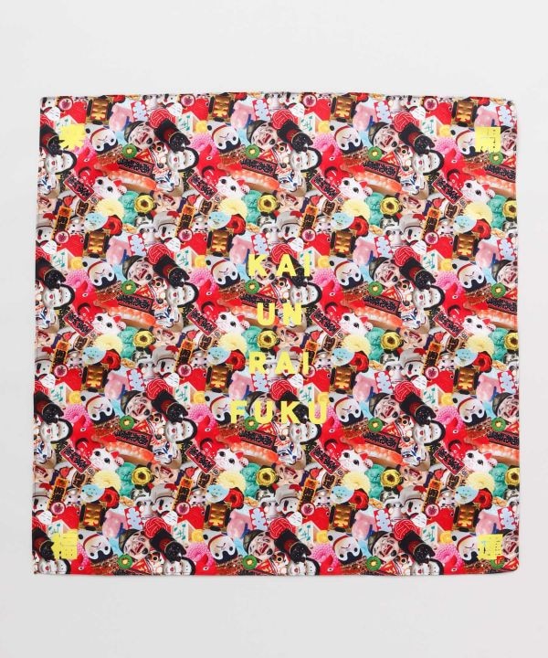 日本の縁起物や祝いものを詰め込んだ、賑やかな「開運来福」風呂敷。撥水生地なので、ちょっとした雨でも中の荷物を守ってくれます。