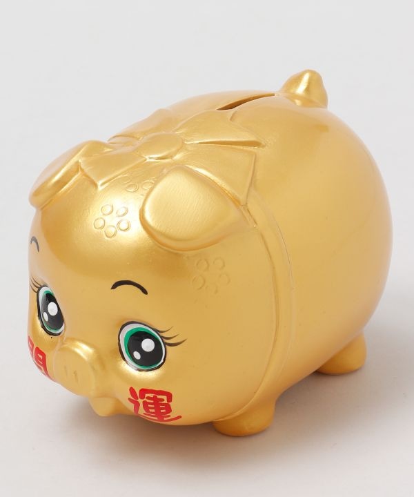 開運がほっぺに書かれた金の豚ちゃん貯金箱。底についている蓋を外すと、お金を取り出せます。豚には幸運や富裕、子孫繁栄を象徴すると云われ、金色は金運上昇の効果があると云われています。