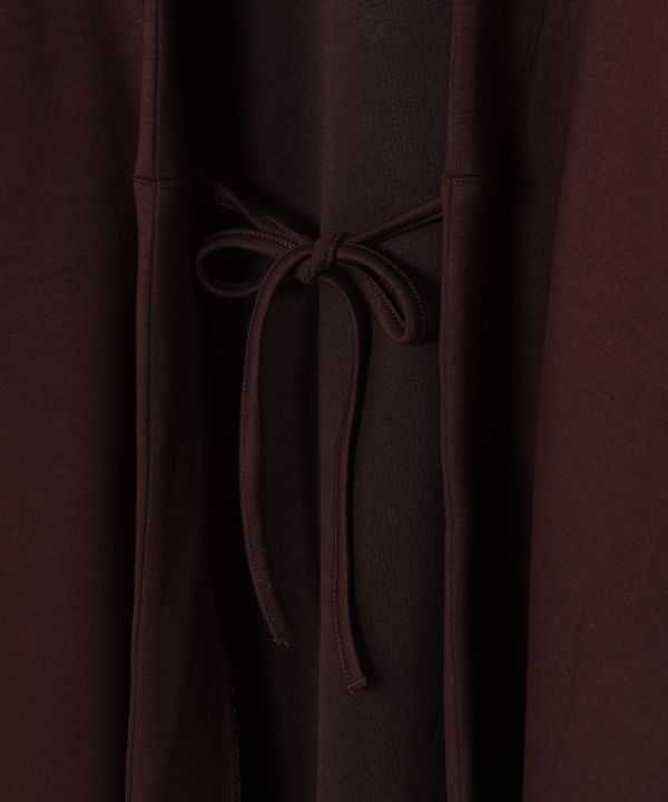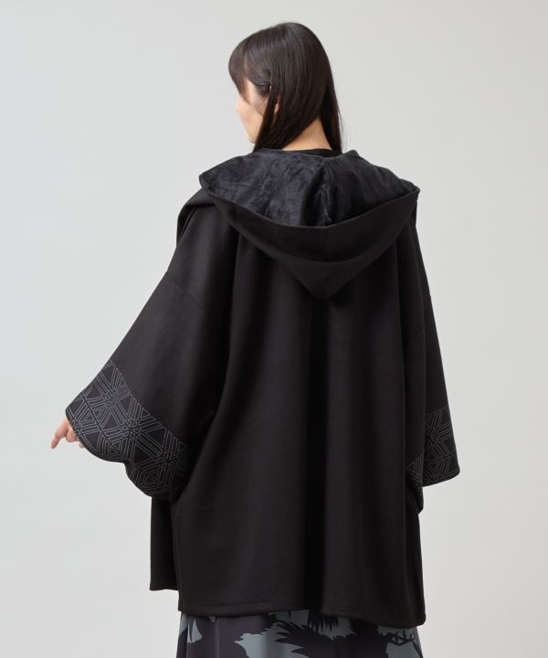 ニット素材の上品な羽織り。取り外し可能なフードマフラーにはボアの裏地がついていて暖かく、巻いたり垂らしてシルエットの変化が楽しめます。袖口の柄には伝統木工技術「組子」文様をテキスタイルに落とし込んだ、和の風情を感じるデザイン。ゆったりとしたサイズ感で性別問わず着用いただけます。