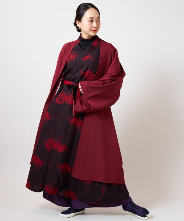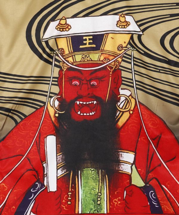 着物を思わせる長羽織。表地より豪華な裏地を忍ばせる「裏勝り」をモチーフにした粋なデザイン。和彫り、閻魔大王、花魁(おいらん)の迫力ある一枚絵が裏地に描かれています。ユニセックスで着用いただけます。