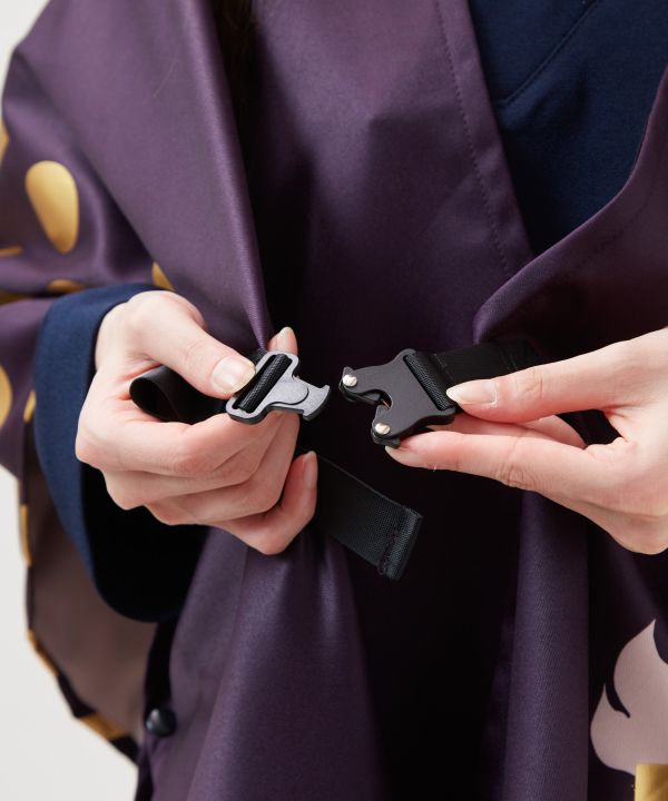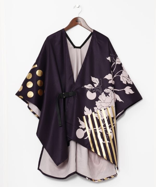 牡丹と幾何学模様を大胆にデザインした羽織。箔プリントが施されており、華やかな印象に。広めの袖幅なので、和装の上からでも着用しやすいです。バックル付きで、着物の袷のようなシルエットを楽しむこともできます。