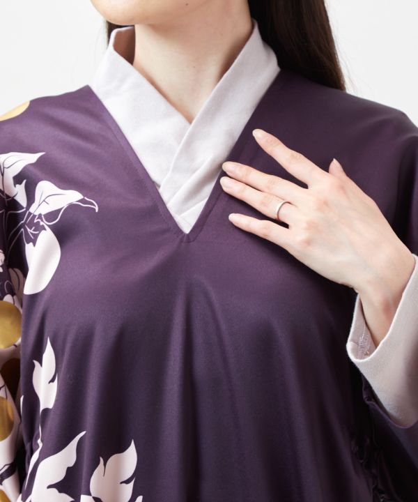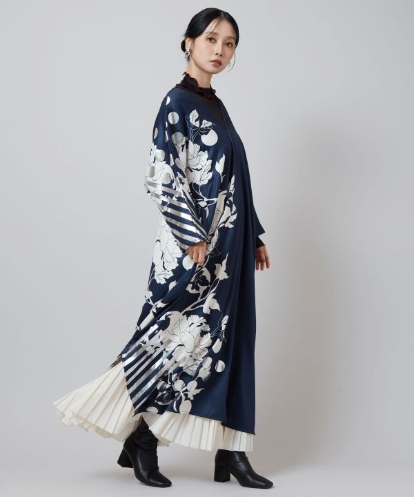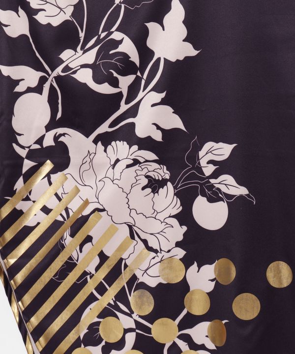 牡丹と幾何学模様を大胆にデザインしたワンピース。箔プリントが施されており、華やかな印象に。ゆったりとしたシルエットで体型を気にせず着用できます。ウエストの紐を絞ってウエストマークもできる一枚。