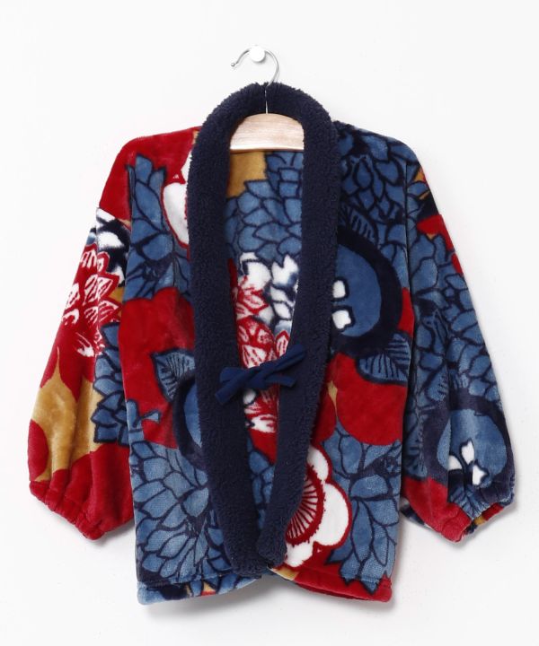 日本の花や浮世絵などのモチーフをデザインした、ブランケット素材の子供用半纏。ふわふわ素材で暖かく、しっかり防寒出来ます。ご家族でお揃いコーデもお楽しみいただけます。