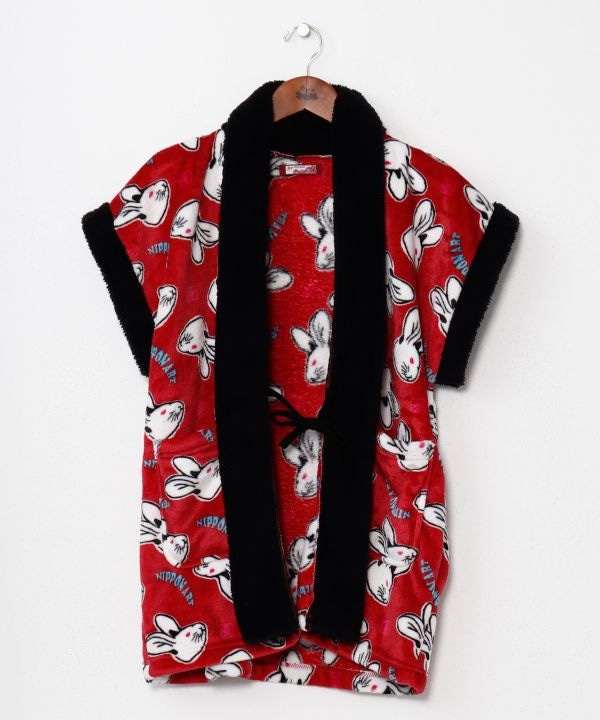 浮世絵から飛び出てきたような、大胆な虎、うさぎが目を惹く、暖かなブランケット素材のやっこ。袖が無いので動きやすく、家事などの作業もしやすい形です。前ポケット付き。ふんわりした肌触りで心もリラックスできること間違いなし。