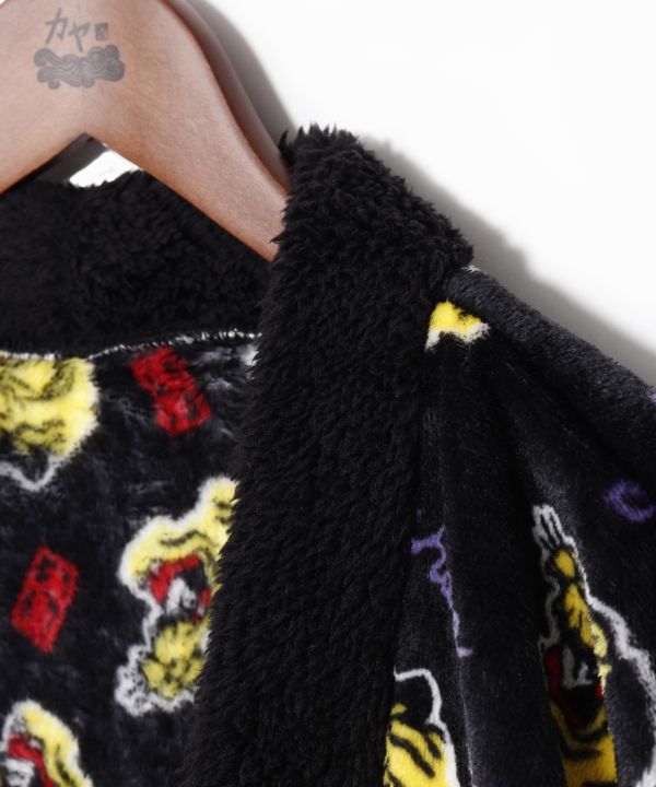浮世絵から飛び出てきたような、大胆な虎、うさぎが目を惹く、暖かなブランケット素材の半纏。長袖でしっかり防寒出来ます。便利な前ポケット付き。ふんわりした肌触りで心もリラックスできること間違いなし。