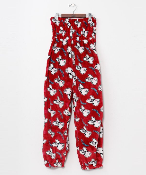 浮世絵から飛び出てきたような、大胆な虎、うさぎが目を惹く、暖かなブランケット素材のもんぺ。腰の部分のゴムが腹巻のようにフィットする、お尻もしっかり暖かいボアパンツ。左右にポケット付き。