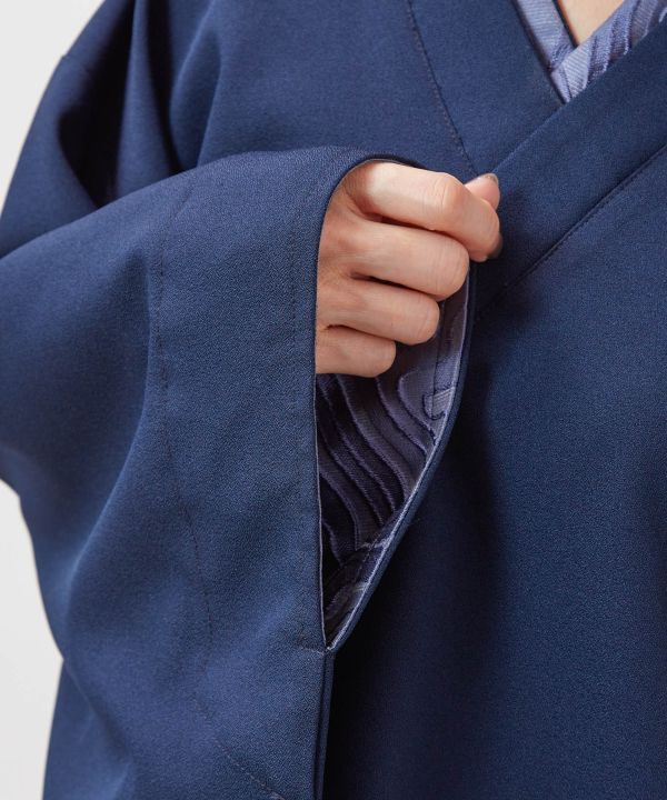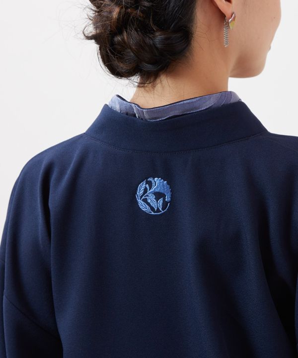 着物に倣(なら)った形のプルオーバー型トップス。衿と袖口に上品なジャカード生地を使用。背中にはオリジナルデザインの花の刺繍「芍薬、百合、ケイトウ」の洒落紋が入っています。同じシリーズのスカートと合わせることで、より着物のような着こなしに。