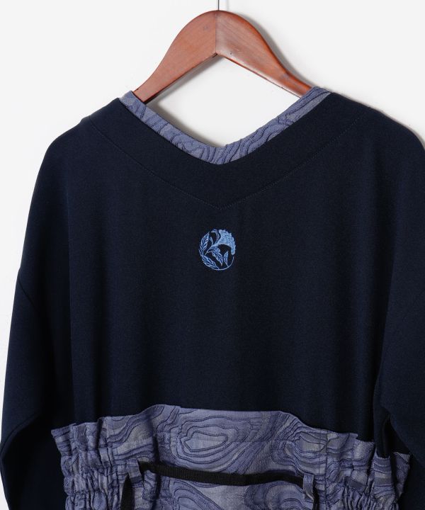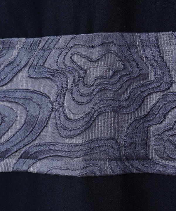 着物に倣(なら)った形のワンピース。ウエストのジャガード生地は着物の帯をイメージしており、背中にはオリジナルデザインの花の刺繍「芍薬、百合、ケイトウ」の洒落紋が入っています。着物風羽織と合わせるとより和装らしさを演出できます。