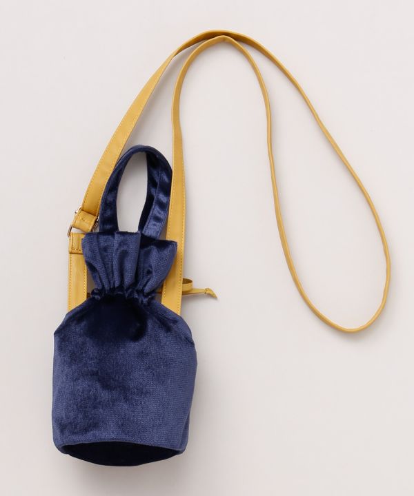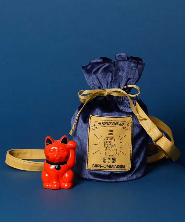 合皮に愛らしい表情の民芸たちを刺しゅうした巾着型のショルダーバッグ。ベロア素材とレトロなカラーで、様々な装いにも合わせやすく、ちょっとしたお出かけにもぴったり。ショルダー紐は長さ調節可能。カードが入るサイズの外ポケット1つ付き。