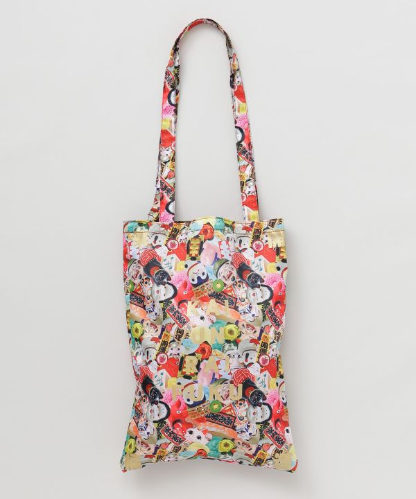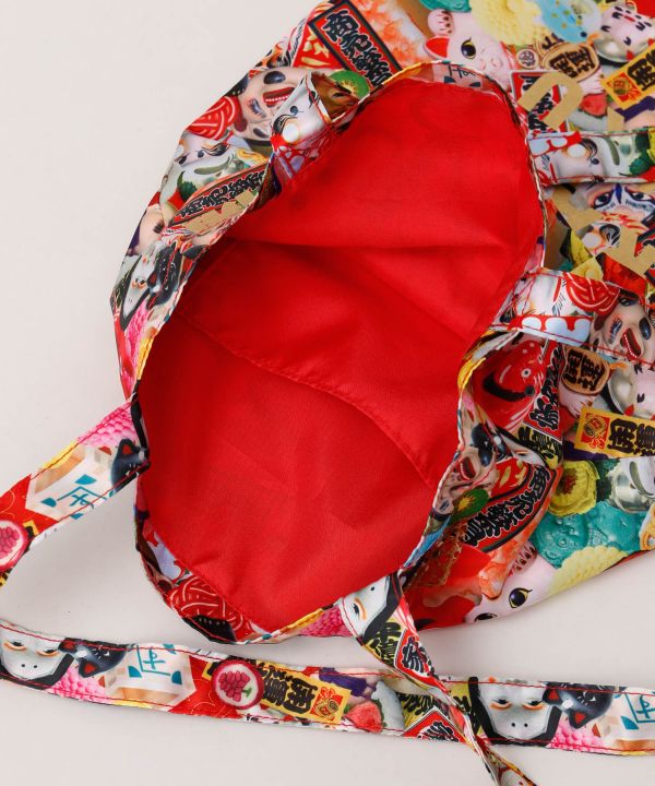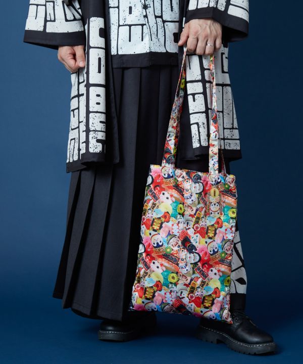日本の縁起物や祝いものを詰め込んだ、賑やかな「開運来福」トートバッグ。使い勝手の良いA3サイズ。インパクト大のデザインで、普段使いはもちろん、お土産や贈り物にもおすすめです。内ポケット1つ付き。