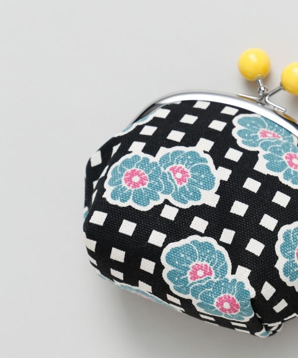 格子柄に花柄を重ねた、レトロポップな印象のマルチがま口。お菓子や小物を入れるのにぴったりなサイズです。