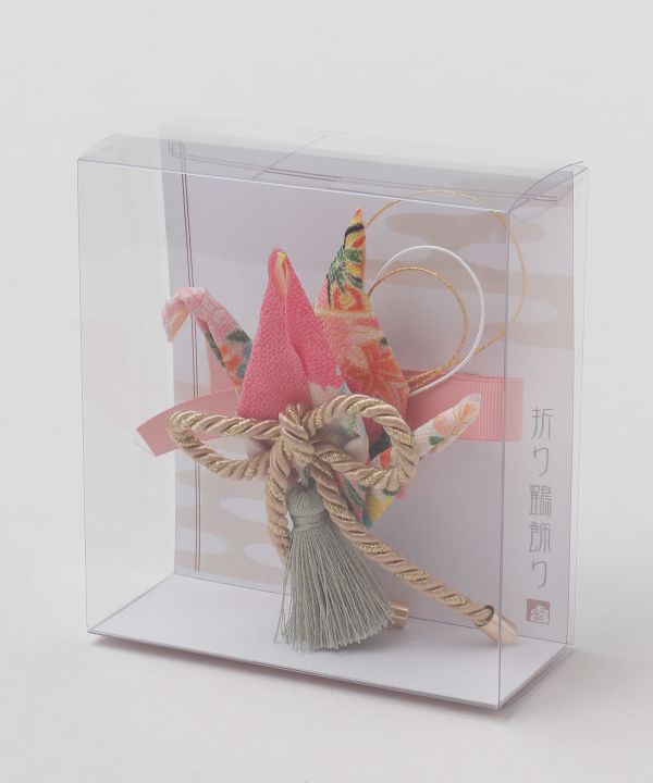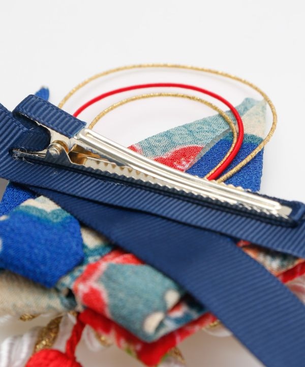 ちりめん素材の折鶴に水引や結び紐を組み合わせた髪飾り。ヘアクリップ仕様で、自由な位置に装着することが出来ます。特別な「ハレの日」におすすめのアクセサリー。