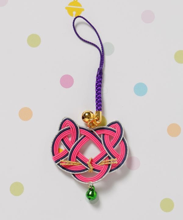 猫の顔を縁起の良い水引で表現したストラップ。首輪をイメージした鈴がアクセント。それぞれの色に願いを込めて、お守りとして身に付けたり、贈り物としてもおすすめ。