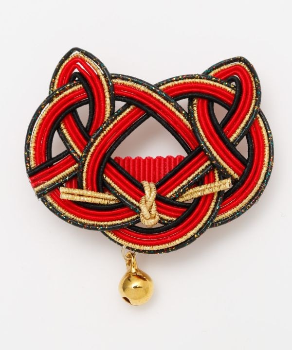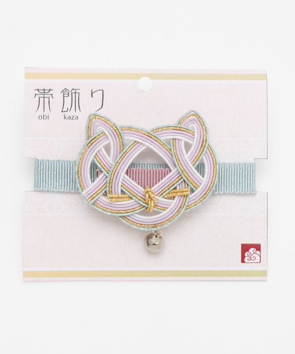猫の顔を縁起の良い水引で表現したストラップ。首輪をイメージした鈴がアクセント。それぞれの色に願いを込めて、お守りとして身に付けたり、贈り物としてもおすすめ。帯締めと合わせて帯留として、ゴムを通せばヘアゴムやブレスレットとしても使えます。