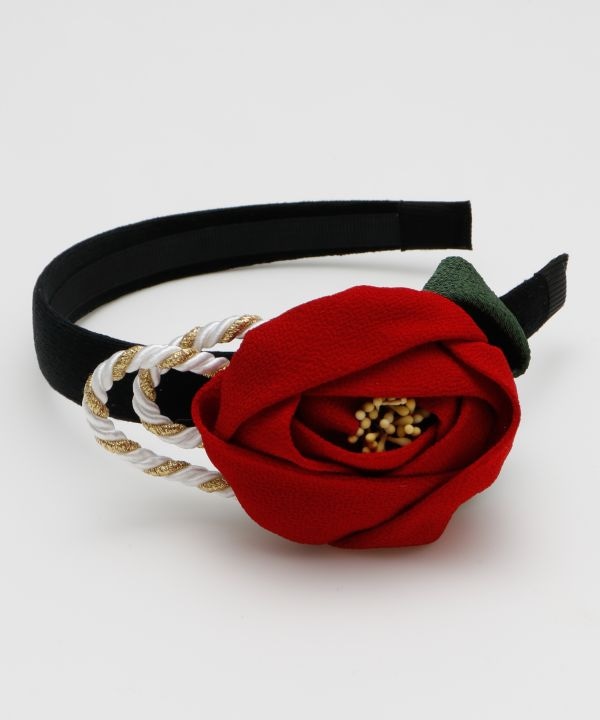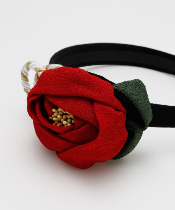 大振りな椿の花をつまみ細工で表現したカチューシャ。煌びやかな結び紐とベロア風素材のカチューシャを組み合わせ、レトロモダンな雰囲気に仕上げました。特別な「ハレの日」はもちろん、普段の装いにも気軽に和の要素を取り入れられるアクセサリー。