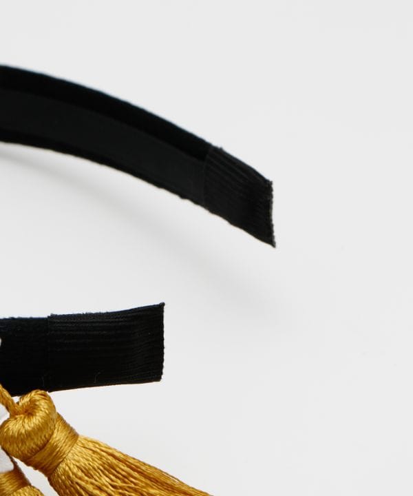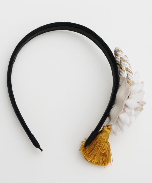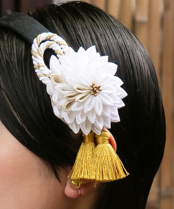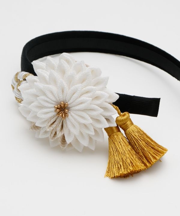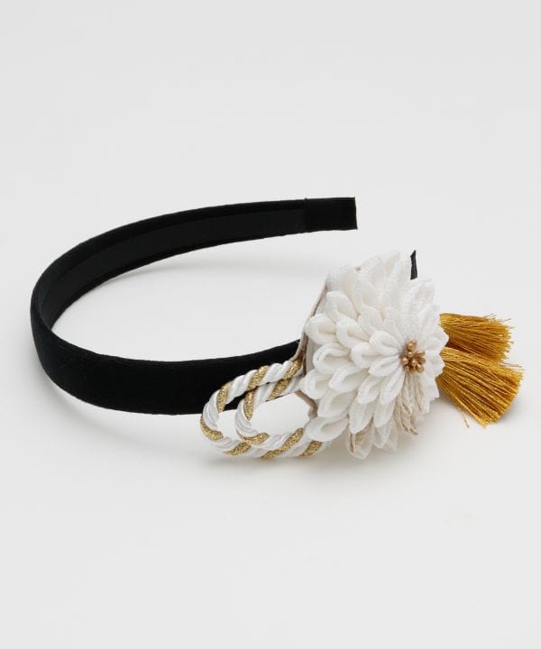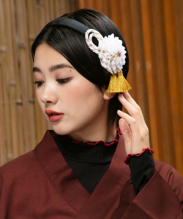 大振りな菊の花をつまみ細工で表現したカチューシャ。煌びやかな結び紐とベロア風素材のカチューシャを組み合わせ、レトロモダンな雰囲気に仕上げました。特別な「ハレの日」はもちろん、普段の装いにも気軽に和の要素を取り入れられるアクセサリー。