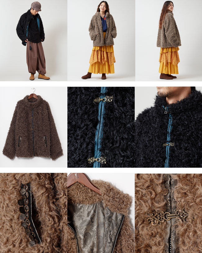 触り心地の良いプードルファー生地のメンズジャケット。艶のあるペイズリー柄の裏地が高級感を増します。前開きにはメタルホックとファスナーを採用。テープ部のコインチャームがアクセントに。チベットの遊牧民が着ている毛皮の防寒着をイメージしたアイテム。