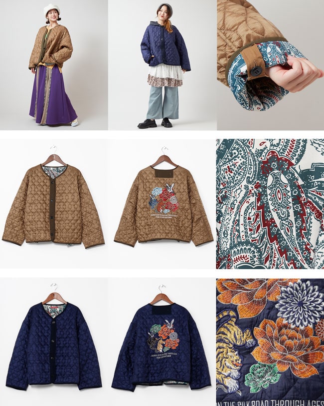 大胆な刺しゅうと総柄の裏地など、ディテールにもこだわったライナージャケット。オリエンタル、カジュアルどちらのコーディネートにも合わせやすいデザイン。刺しゅうには金糸を使用、グラデーションでさらに豪華さを演出しました。柄は中国の国花(牡丹)と日本の国花(菊)、さらに日本の縁起の良い生き物である鶴と中国の威厳の象徴である虎を融合させたもの。シルクロードで出会う中国のオリエンタルな雰囲気を刺しゅうに落とし込みました。英文の意味は「時代を超えたシルクロードの旅 牡丹と菊」。