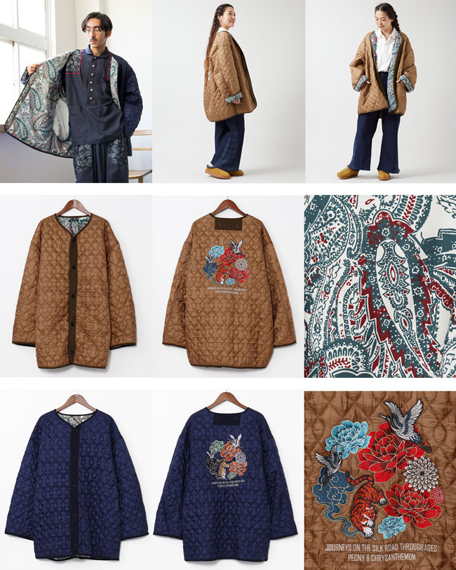大胆な刺しゅうと総柄の裏地など、ディテールにもこだわったメンズライナージャケット。オリエンタル、カジュアルどちらのコーディネートにも合わせやすいデザイン。刺しゅうには金糸を使用、グラデーションでさらに豪華さを演出しました。柄は中国の国花(牡丹)と日本の国花(菊)、さらに日本の縁起の良い生き物である鶴と中国の威厳の象徴である虎を融合させたもの。シルクロードで出会う中国のオリエンタルな雰囲気を刺しゅうに落とし込みました。英文の意味は「時代を超えたシルクロードの旅 牡丹と菊」。