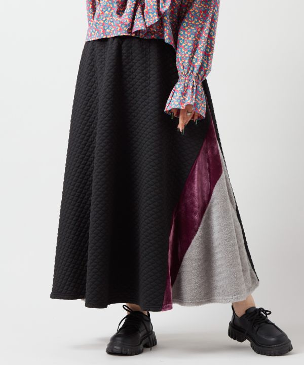 温かいふっくらとした素材感と張りのある生地により、ボリューム感がしっかり出る型崩れしないスカート。ミナレットのタイル模様を彷彿とさせる編み柄のデザイン、ベロアとシャギー素材の他にはない異素材ミックスが個性的。